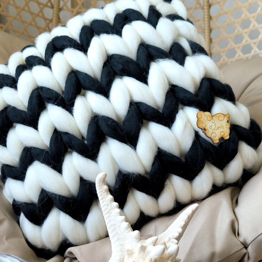 Pletený polštář z ovčí vlny, černobílý